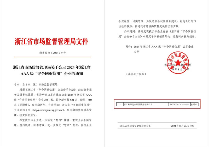 近日,浙江省市场监督管理局公示了2024年浙江省AAA级“守合同重信用”企业名单,浙江勤泽美业环保服务有限公司位列其中,这是公司自2020年以来连续4年获得该荣誉。