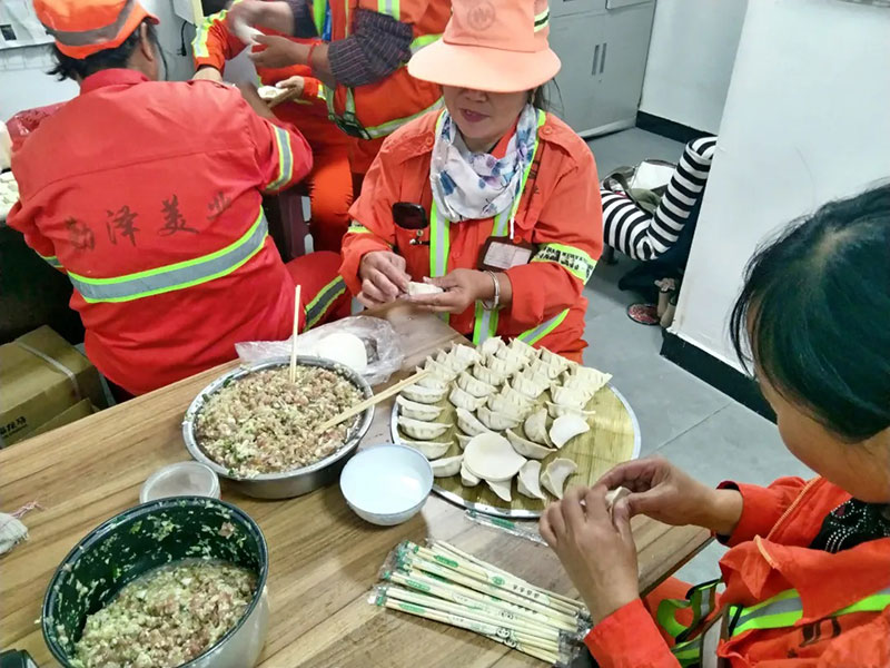 在这个特殊的日子里,勤泽美业上城项目部别出心裁,组织了一场温馨的包饺子活动,为坚守岗位的一线环卫员工送上了一份特别的节日礼物。活动现场,大家围坐一堂,亲手包制美味的饺子,欢声笑语中洋溢着家的温暖。当一盘盘热气腾腾的饺子端上桌时,每一位环卫工人的脸上都洋溢着幸福的笑容。